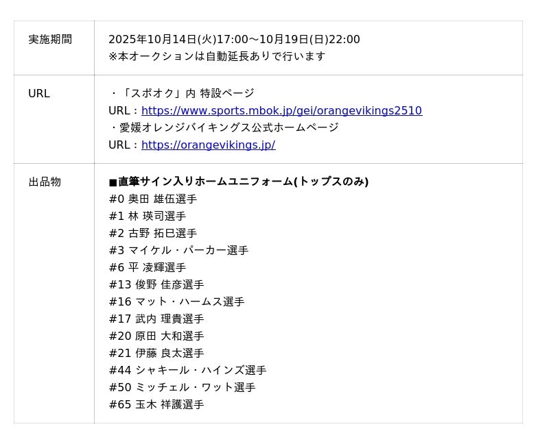株式会社モバオク(本社:東京都渋谷区、代表取締役社長:小一原 宏樹、以下モバオク)がエンゲート株式会社(本社:東京都中央区、代表取締役:城戸 幸一郎、以下エンゲート)と業務提携し提供するスポーツチーム公式オークションサービス「スポオク」にて、B.LEAGUE所属の愛媛オレンジバイキングスが実施する『愛媛オレンジバイキングス シーズン開幕記念!最速オークション』を2025年10月14日(火)から開始します。
