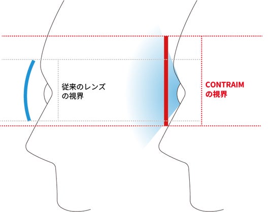 ■歪みなき広い視界を実現する「大型成形平面レンズ」縦方向にカーブが無いため、視界ほぼすべてをレンズで覆うことができ、これまでにない広く、光学的に優れた広い視界を実現します。