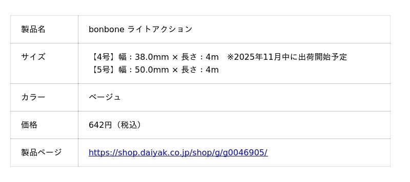 関節等の固定に特化し、従来のホワイトテープに近い高い固定力を持ちながら、体の曲面にもシワなくキレイに貼れる新感覚の低伸縮テーピング「bonbone ライトアクション」を、2025年10月より発売いたしました。