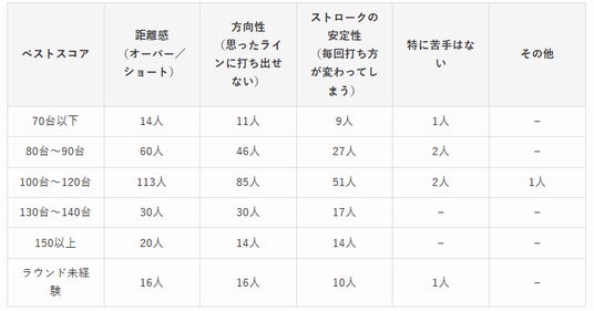 ベストスコア別にみると、100~120台の層では「距離感」が113人となっており、初心者にとっては3パットを減らすことが課題であることが示唆されています。
