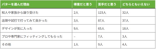 また知人や家族から譲り受けたパターを使用している人のうち、123人が「パッティングが苦手」と回答しており、自分の体格やストロークに合わないものが構えたときの違和感やストロークの安定性に影響を及ぼしていると考えられます。