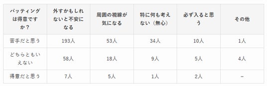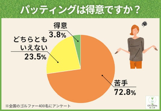 ゴルファーの約7割にあたる72.8%(291人)が「パッティングは苦手」と回答しており、「得意」と答えた人はわずか3.8%(15人)にとどまりました。