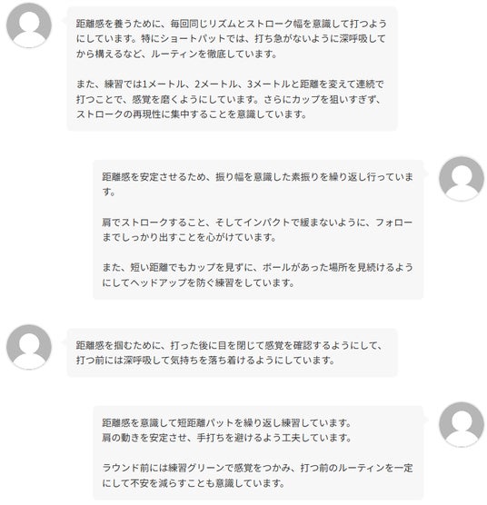 パッティングは多くのゴルファーが「苦手」と感じている一方で、克服のためにそれぞれが工夫や意識を持って練習に取り組んでいます。特に課題として挙がりやすい「距離感」や「方向性」に対しては、日常の練習やラウンド前の準備に工夫を加えることで改善を図ろうとする声が目立ちました。