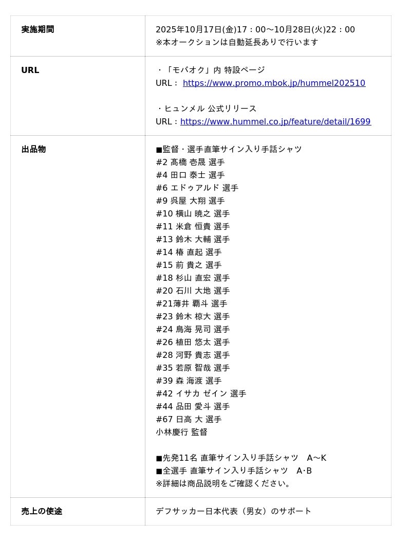 株式会社モバオク(本社:東京都渋谷区、代表取締役社長:小一原 宏樹、以下モバオク)が運営するオークションサービス「モバオク」にて、株式会社エスエスケイ(以下、エスエスケイ)が実施する「ジェフユナイテッド市原・千葉×ヒュンメル 手話シャツ チャリティーオークション」を、2025年10月17日(金)から開始いたします。