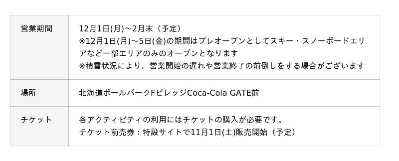 - 12/1(月)北海道ボールパークFビレッジ「F VILLAGE Snow Park」が大きく進化してオープン!今年は定番のスキーやスノーボード、そり遊びに加えて新たな「雪遊び」が追加