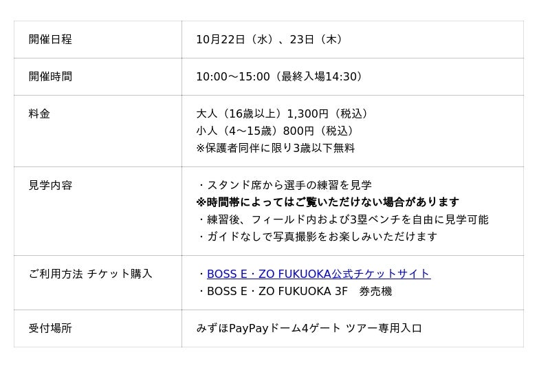 ファンの皆さまのおかげで、福岡ソフトバンクホークスは「2025 パーソル クライマックスシリーズ パ」を突破しました。引き続き、日本一に向けて負けられない戦いとなる「SMBC 日本シリーズ 2025」の試合日限定で、大好評のドームツアー開催が決定!さらに、日本シリーズ直前には、特別企画「練習見学+フリー見学コース」も実施します!日本一を目指して調整を進める選手たちの姿を、スタンド席から間近にご覧いただけます。練習後には、フィールド内や3塁ベンチなど、普段は入ることができないエリアを自由に見学可能です。
