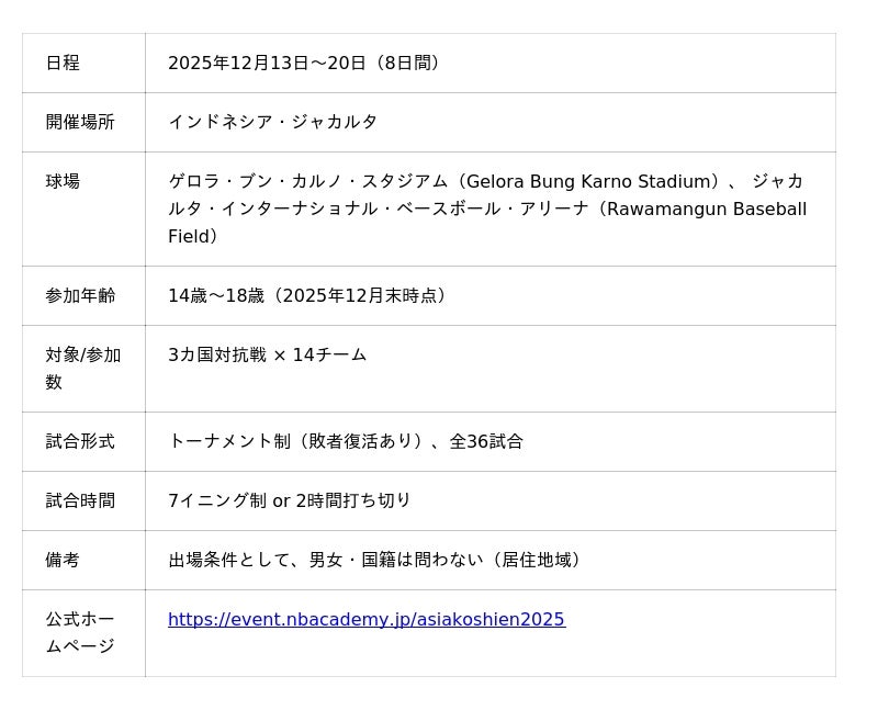 一般社団法人NB.ACADEMY(本社:東京都渋谷区、代表理事:柴田章吾、以下「当社」)は、2025年12月にインドネシア・ジャカルタで開催予定の「第2回アジア甲子園大会」において、株式会社朝日新聞社(本社:東京都中央区、代表取締役社長CEO:角田克)および朝日放送テレビ株式会社(本社:大阪市福島区、代表取締役社長:今村俊昭)が共同で運営する高校野球総合情報サイト「バーチャル高校野球」(以下「バーチャル高校野球」)とのメディアパートナー契約を更新したことをお知らせいたします。