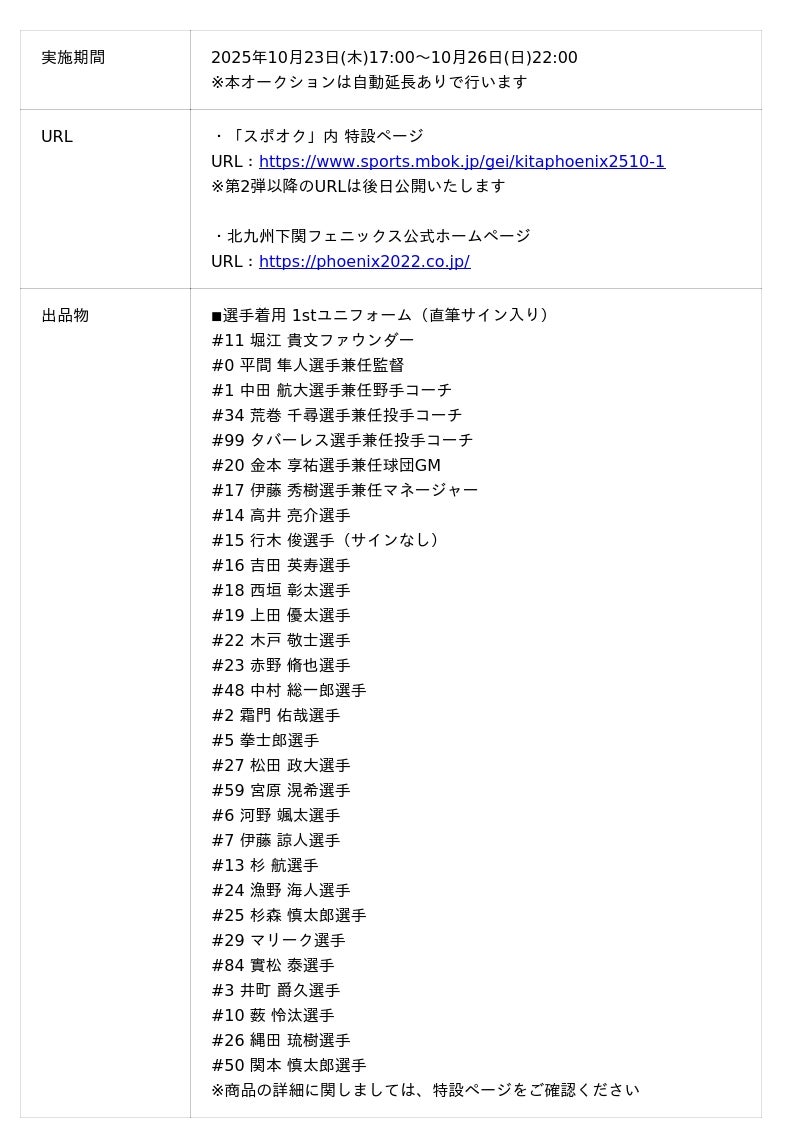 【北九州下関フェニックス2025シーズンプレミアムオークションVol.1 概要】