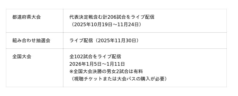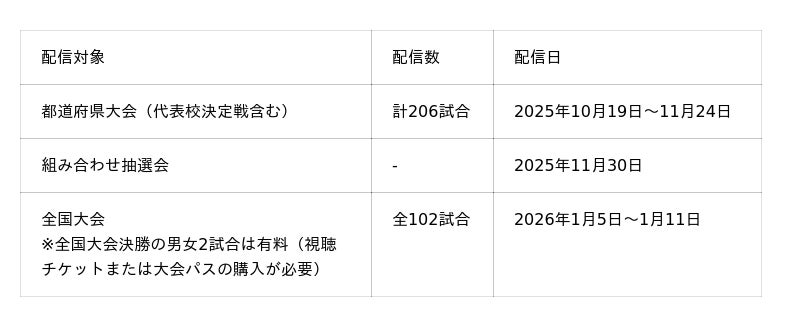 以下の試合を無料でライブ配信します。なお、全国大会決勝の男女2試合は、1試合単位での視聴チケット(税込2,000円)にてご視聴いただけます。