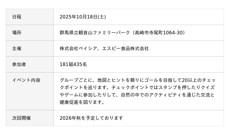 株式会社ベイシア(本社:群馬県前橋市、代表取締役社長:相木孝仁)とエスビー食品株式会社(本社:東京都中央区、代表取締役社長:池村和也)は、2025年10月18日(土)、群馬県立観音山ファミリーパークにて「第38回ベイシア・S&B杯 ファミリーウォークラリー」を開催しました。