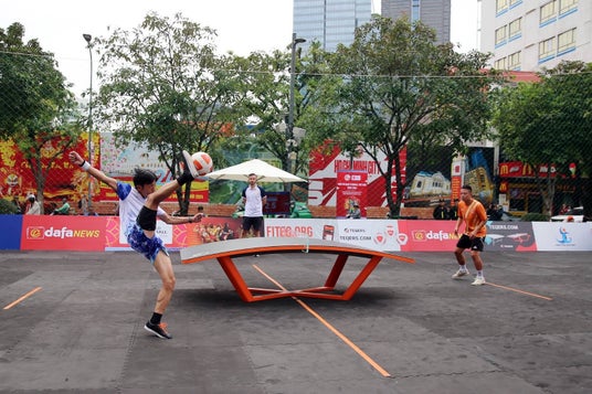 湾曲したテーブル上で、サッカーボールをリフティングしたりヘディングしたりして、相手コートへ向かって打ち合い得点を競う、いわば「サッカー」と「卓球」を組み合わせたスポーツです。
