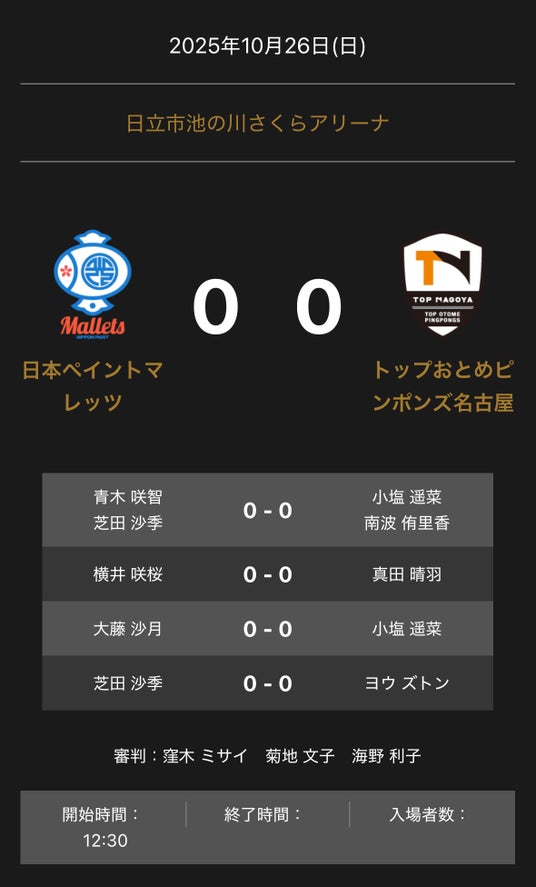 - ノジマTリーグ 2025-2026 公式戦 10月26日開催 日本ペイントマレッツ vs トップおとめピンポンズ名古屋 対戦オーダー発表