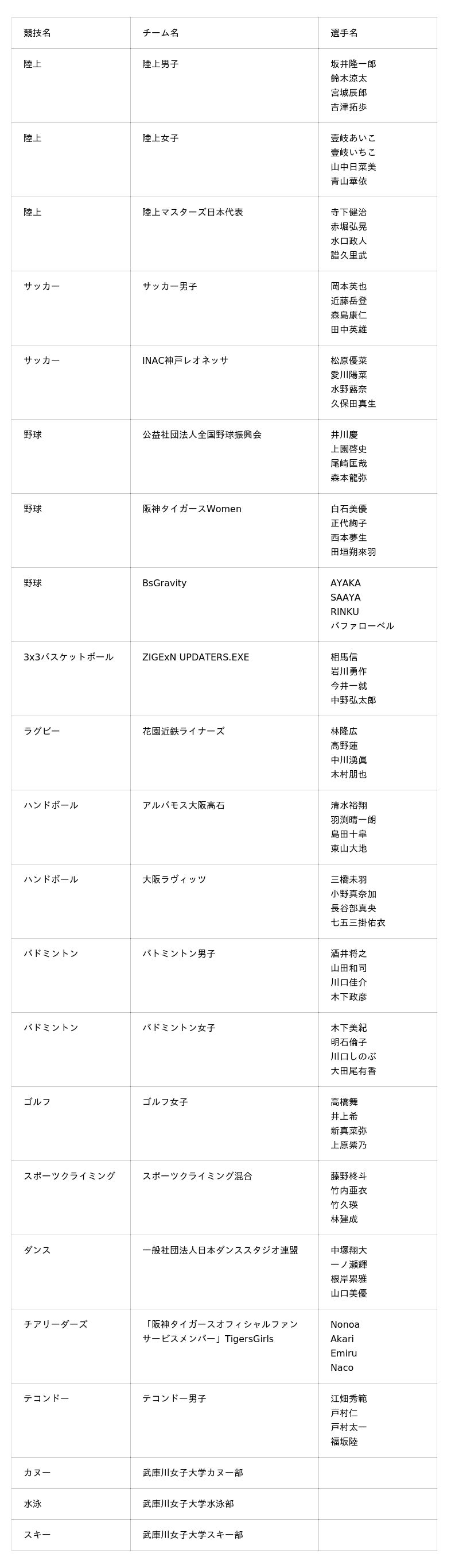スポーツ別対抗戦参加チーム(敬称略)