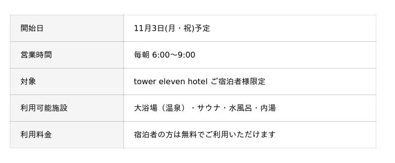 tower eleven hotel では、11月から宿泊者限定で朝風呂・朝サウナを開始いたします。