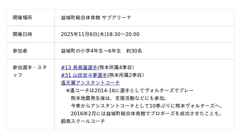 Bリーグ(ジャパン・プロフェッショナル・バスケットボールリーグ)2部に所属する熊本ヴォルターズ(熊本バスケットボール株式会社/熊本市中央区)では、2025年11月6日にクラブが生まれ育ったふるさと益城町で、選手によるバスケット教室を開催することとなりましたので、お知らせいたします。