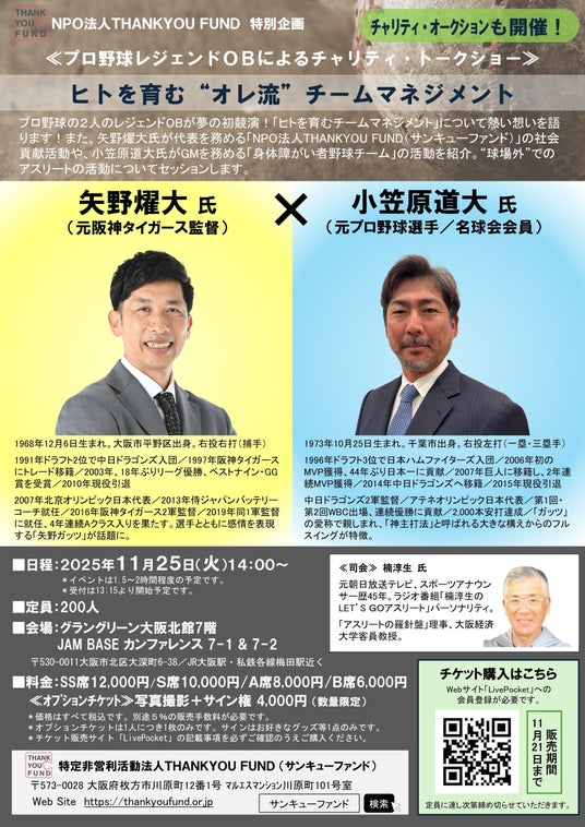 特定非営利活動法人THANKYOU FUND(サンキューファンド)(本社:大阪府枚方市川原町12番1号マルエスマンション川原町101号室/代表理事:矢野輝弘)は、「(チャリティ・トークショー)ヒトを育む“オレ流”チームマネジメント」を2025年11月25日(火)14時から開催します。プロ野球界の2人のレジェンドOBが夢の初競演!「ヒトを育むチームマネジメント」について2人が熱い想いを語ります!