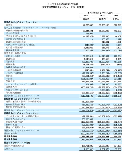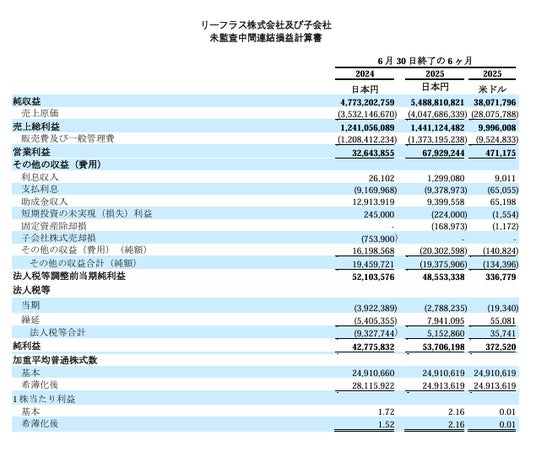 米国東部時間2025年10月30日 ― 子ども向けスポーツスクール事業や部活動支援事業などを展開するリーフラス株式会社(NASDAQ:LFS)(以下「当社」または「リーフラス」)は、本日、2025年上半期の未監査財務諸表を発表しました。