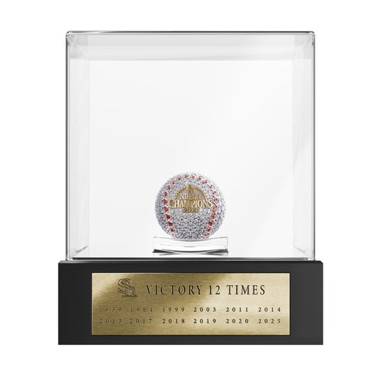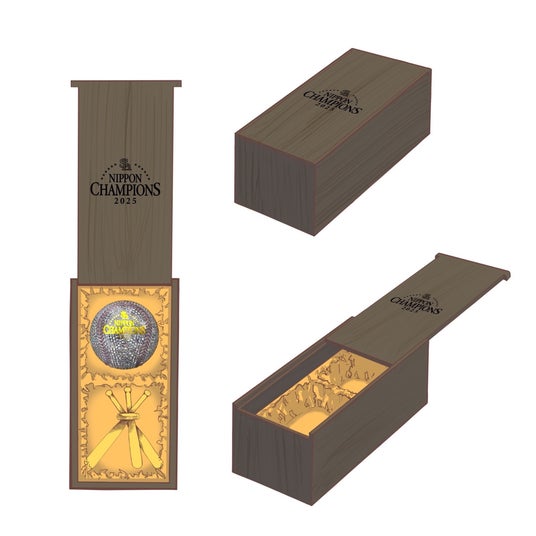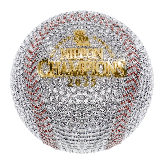 実際の硬式ボールと同サイズの純プラチナ製ボールに、婚約指輪にも使われるクオリティのダイヤモンド2009個(総計約200ct)を贅沢に敷き詰めた、比類なき逸品。縫い目部分にはルビーの中でも最高品質とされるピジョンブラッドルビーを、そしてチャンピオンロゴにはK18イエローゴールドを使用。ボールを支えるのは、3本の純金製バットスタンドです。黄金の輝きがプラチナの光を際立たせ、栄光と誇りを演出します。ダイヤモンドの一粒一粒が優勝の記憶を刻む、 唯一無二の日本一記念モデルです。(完全受注生産)