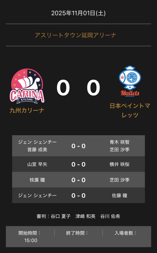 - ノジマTリーグ 2025-2026シーズン 公式戦 11月1日開催 九州カリーナ vs 日本ペイントマレッツ 対戦オーダー発表