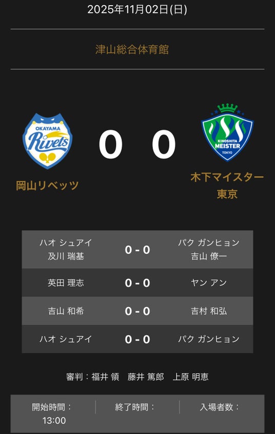 - ノジマTリーグ 2025-2026シーズン 公式戦 11月2日開催 岡山リベッツ vs 木下マイスター東京 対戦オーダー発表