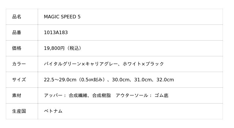 「MAGIC SPEED 5」は、レース本番だけでなくトレーニングシーンにもおすすめのカーボンプレートを搭載したランニングシューズです。本モデルは、中高生などより多くのランナーが使用できるよう、ソール全体の厚みを最大約37.5mm(40mm以下)としています。前モデルより約6mm薄くなったことで、約49グラム(27.0cm/片足重量)の軽量化を実現しました。また、これまで同様にカーボンプレートをミッドソール(甲被と靴底の間の中間クッション材)の前部から後部にかけて搭載し、蹴り出し時の足の動きを安定させ、効果的に身体を前方向へ推進させるようにしています。