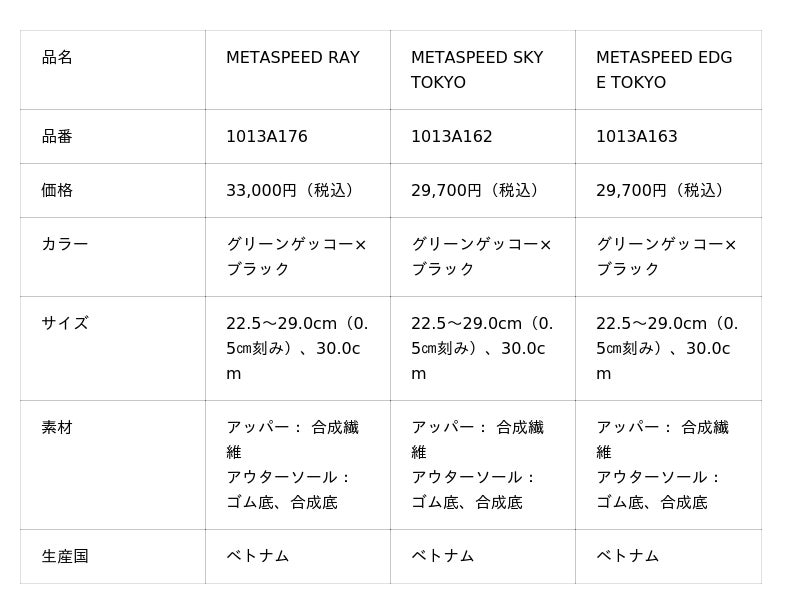 軽量性を追求したモデル「METASPEED RAY(メタスピードレイ)」、ストライド型のランナーがストライドをより伸ばし、少ない歩数でゴールできることを追求した「METASPEED SKY TOKYO(メタスピードスカイトウキョウ)」、ピッチ型のランナーがピッチを調節しながらストライドを伸ばし、少ない歩数でゴールできることを追求した「METASPEED EDGE TOKYO(メタスピードエッジトウキョウ)」の3モデルを用意し、ランナーにさらなるスピードと自信、そして選択肢を与えます。