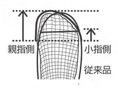 - 左右別立体:親指側は高く、小指側は低い“非対称”つま先で、指先の圧迫やシワを抑制。