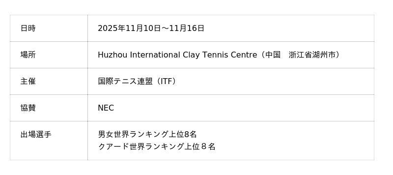 本大会を初めて中国で開催できることを大変嬉しく思います。今回の開催は、車いすテニスを世界に広めるという私たちの使命において、重要な一歩となります。シーズンを締めくくる本大会は、車いすテニスの最高峰が披露される舞台です。1994年からスポンサーを務めるNECは、草創期から車いすテニスを支えてきた重要な存在であり、その長年にわたる支援に心から感謝しています。新設の世界水準のテニスコート「Huzhou International Clay Tennis Center」での開催にあたり、2025年の全豪オープンおよびウィンブルドン女子ダブルス優勝者であるWang Ziying選手、Li Xiaohui選手を含む中国のトップ選手が、世界のトップアスリートたちと肩を並べて競い合う姿を見るのは非常に楽しみです。世界、そしてアジアにおいて次世代の車いすテニス選手にインスピレーションを与える絶好の機会であり、1週間にわたって繰り広げられる車いすテニスの熱戦にぜひご注目ください。