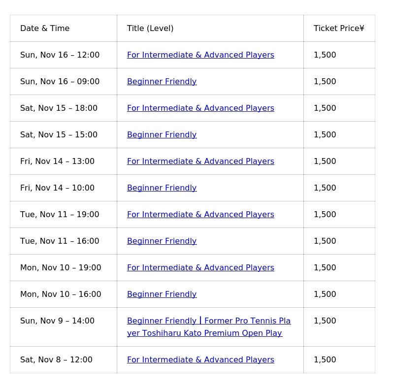 イベント検索サイト「Peatix」またはテニスイベント検索「テニスベア」からご確認・お申込みいただけます。
