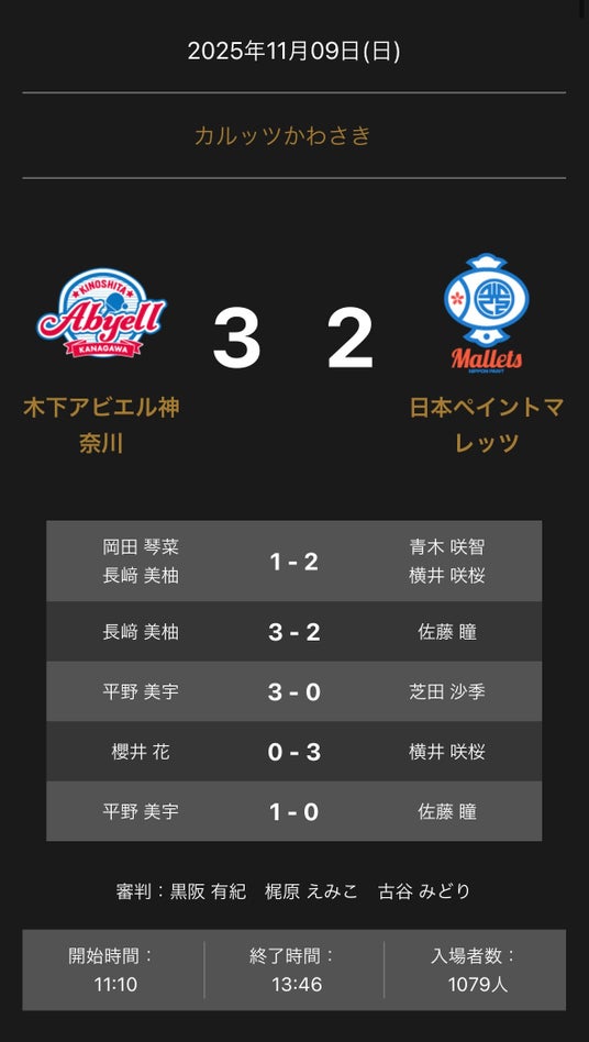 ノジマTリーグ 2025-2026シーズン 公式戦 11月9日(日)開催 「木下アビエル神奈川 vs 日本ペイントマレッツ」の試合は、3-2で木下アビエル神奈川が勝利しました。