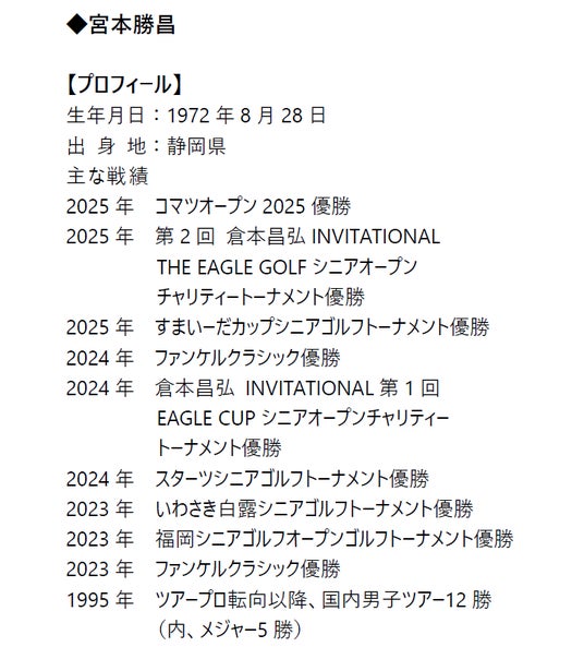11月8日~11月9日に鳩山カントリークラブ(埼玉県)で行われた国内シニアツアー「コスモヘルスカップ シニアゴルフトーナメント2025」において、2位からスタートした総合契約の宮本勝昌が最終日5バーディ、3ボギーの70でプレーし、通算7アンダーとしてトップタイでホールアウト。その後、プレーオフを制し、今季シニアツアー4勝目、国内シニアツアー10勝目を果たしました。なお、5位タイにはボール・用品契約の寺西明、9位タイにはボール・用品契約の東聡が入りました。