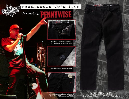 「FROM SOUND TO STITCH(音から縫い目へ)」をテーマに、PENNYWISEとのコラボレーションデニムが登場。ライブフォトを再構築した内側に施されたプリント、左足裏に配されたPENNYWISEロゴ刺繍、そしてバックポケットにはVolcom Entertainment × PENNYWISEのWネームパッチ。