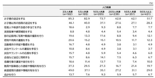 いずれの項目でも「3万人未満」でもっとも割合が高く、人口規模の小さい自治体では、公立中学の運動部活動における保護者の関与が多い傾向にあるといえる。