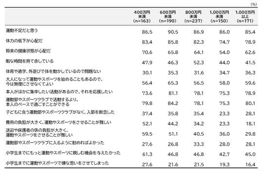 運動部やスポーツクラブに加入していない子どもの保護者に対し、日ごろの様子や運動・スポーツに関する意識をたずねた。世帯年収別に分析すると、全体でも数値が高かった「運動不足だと思う」「体力の低下が心配だ」「本人がほかに集中したい活動があるので、それを応援したい」「運動部やスポーツクラブで活動するより、本人のペースで過ごすことができる」は、いずれの年収群でも7~9割程度と高い割合を示した。世帯年収によって差がみられたのは、「費用の負担が大きく、運動やスポーツをさせることが難しい」(400万円未満52.1%、1,000万円以上18.1%、以下同)や「送迎や保護者の係の負担が大きく、運動やスポーツをさせることが難しい」(59.5%、29.8%)で、世帯年収が低い群ほど「そう思う」とする割合が高かった。また、「小学生までにもっと運動やスポーツに親しむ機会を与えたかった」は400万円未満が61.3%と、ほかの群を15ポイントほど上回っていた。