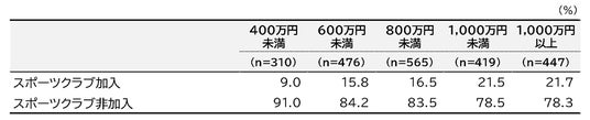 本調査は、保護者の目線から中学生のスポーツ機会や活動の実態を明らかにし、家庭環境や地域による違いを把握する目的で行われました。運動部活動は費用負担が比較的少なく、加入率は調査対象者全体で5割にのぼり、世帯年収400万円未満の群でも42.3%となりました。一方で、この数値はその他の年収群に比べて約10ポイント低く、統計的にも有意な差がみられます。スポーツクラブの加入率は年収が上がるにつれて段階的に高まり、400万円未満では9%、1,000万円以上では21%となりました。