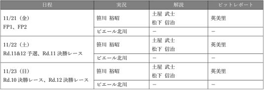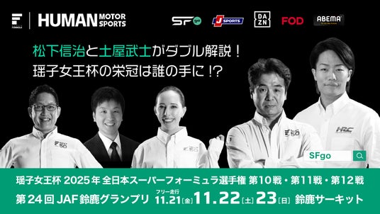 国内最高峰で最速の自動車レースシリーズである全日本スーパーフォーミュラ選手権(以下「SUPER FORMULA」)を運営する株式会社日本レースプロモーション(以下「JRP」)は、11月21日(金)・22日(土)・23日(日)の3日間、鈴⿅サーキット(三重県鈴⿅市)で開催される「瑶子女王杯 2025年 全日本スーパーフォーミュラ選手権 第10戦・第11戦・第12戦 第24回JAF鈴⿅グランプリ」の放送予定および公式放送の出演者を発表しました。