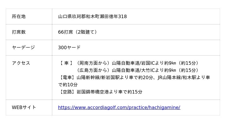 株式会社アコーディア・ゴルフ(本社:東京都台東区、代表取締役社長:三好 康之、以下「当社」)は、ゴルフ練習場「アコーディア・ガーデン蜂ヶ峯(はちがみね)」(山口県玖珂郡和木町、以下「AG蜂ヶ峯」)において、このたび改装工事が完了し、リニューアルオープンいたしましたのでお知らせいたします。