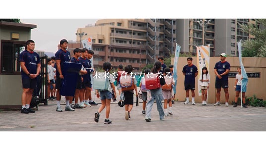 冒頭:ラグビーを象徴するプレー「スクラム」からスタート。立ち上がる力、挑戦への覚悟を表現しています。