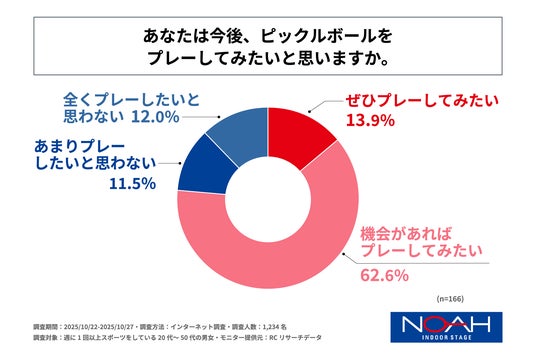 次に、ピックルボールのプレー経験がないと回答した人を対象に「今後、ピックルボールをプレーしてみたいと思うか」を尋ねる設問への回答では、1位が「機会があればプレーしてみたい」で62.6%、2位が「ぜひプレーしてみたい」で13.9%、3位が「全くプレーしたいと思わない」で12.0%という結果になりました。1位と2位の回答を合計すると回答率76.5%となり、この結果から、週に1回以上スポーツをしており、ピックルボールのプレー経験がない20代~50代の男女の75%以上が、今後ピックルボールをプレーしてみたいと考えていることがわかりました。