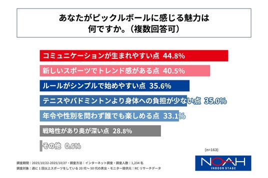 また、ピックルボールのプレー経験がある(数回プレーしたことがある、定期的にプレーしている)と回答した人を対象に「ピックルボールに感じる魅力」を尋ねる設問への回答では、1位が「コミュニケーションが生まれやすい点」で44.8%、2位が「新しいスポーツでトレンド感がある点」で40.5%、3位が「ルールがシンプルで始めやすい点」で35.6%という結果になりました。この結果から、週に1回以上スポーツをしており、ピックルボールのプレー経験がある20代~50代の男女が、ピックルボールに感じる主な魅力は「コミュニケーションが生まれやすい点」や「新しいスポーツでトレンド感がある点」であることが明らかになりました。