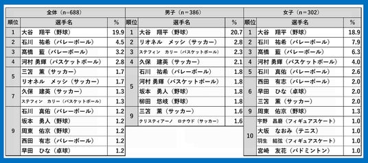 最新の調査は2025年6~7月に実施。青少年(12~21歳)の「好きなスポーツ選手」調査結果で、282名の名前があげられた中、1位が大谷翔平、2位が石川祐希、3位が高橋藍であることが分かりました。性別、学校期別でも大谷翔平が圧倒的1位となりました。