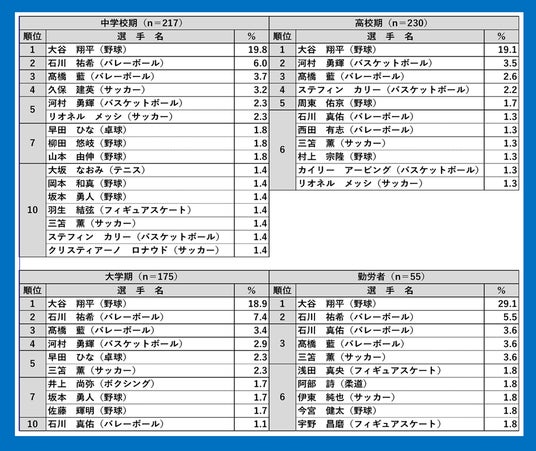 学校期別にみると「大谷翔平」が中学校期19.8%、高校期19.1%、大学期18.9%、勤労者29.1%といずれの学校期においても1位であり、高い人気を示した(表3)。中学校期・大学期・勤労者では「石川祐希」が6.0%、7.4%、5.5%と2位で続いた。高校期では「河村勇輝」が2位となった。表3. 好きなスポーツ選手(12~21歳:学校期別)