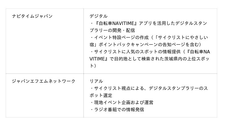本取組では、茨城県内のサイクルルート沿線やサイクリストにやさしい宿での消費額の増加を図ることを目的とし、ナビタイムジャパンの自転車専用ナビゲーションアプリ『自転車NAVITIME』の技術とノウハウ、JFNのラジオ番組の発信力とイベント企画運営ノウハウを連携させます。
