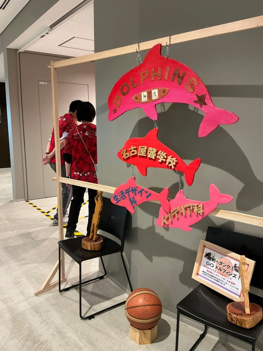 試合当日には、寄付先である愛知県立名古屋聾学校の生徒らによる手話ブースがあり、ドルファミでにぎわいました。名古屋Dの使用済みボールを生徒がアップサイクルした木工作品も並び、普段から交流のある様子が感じられるブースとなりました。選手の名前を指文字で教わった後に、推し選手の名前を手で覚えようと練習し続ける小学生がいたり、手話でのあいさつを教えてもらう女性がいたり、手話への興味が広がるイベントとなりました。