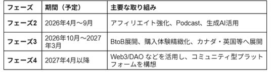 フェーズ2以降では、Podcast 配信や BtoB 展開を通じて収益源の多様化を図り、北米市場での拡大を見据えた新たな事業の柱として成長を目指します。