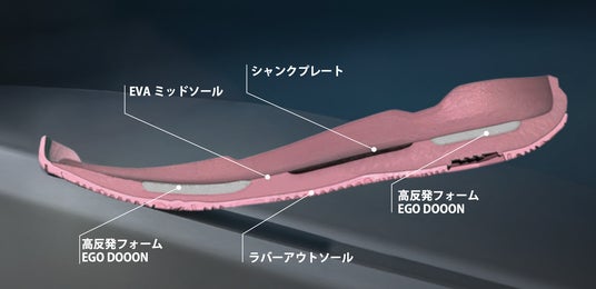 前足部は「コートを掴む感覚」を最大限に活かすために足裏と地面の距離を近く設定し、より瞬発的な動作を可能に。ミッドソール全体はEVA(合成樹脂)を採用、前後2箇所にEVAとは硬度の異なるEGOZARUの独自開発高反発フォームEGO DOOON(エゴドーン)を配し、前足部は接地感を損なわない適度な反発性を、踵部は安心感のあるクッション性を体感できる設計。さらに、中間層にねじれを抑制するシャンクプレートを内蔵することで安定感のある履き心地を実現。