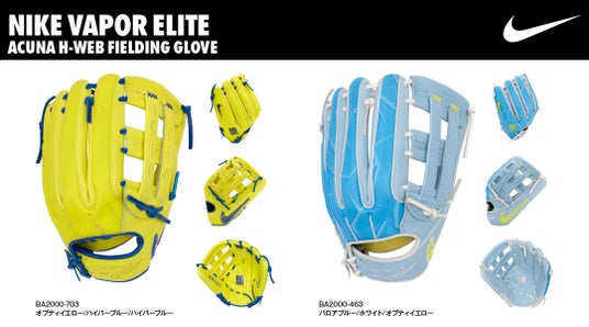 次世代のスター選手を育成するため、ユース層に向けた「ナイキ ユース ヴェイパーエリート アクーニャ H-ウェブ グラブ」も充実しています。MVPアクーニャ・ジュニアの情熱的なカラーリングを反映し、軽量性とコントロール性を重視したフルシンセティックバック(全合成素材の背面)を採用。若年層でも扱いやすいよう、軽量化と構造的なサポート(ロールデュアルウェルティングシステム)を両立しています。