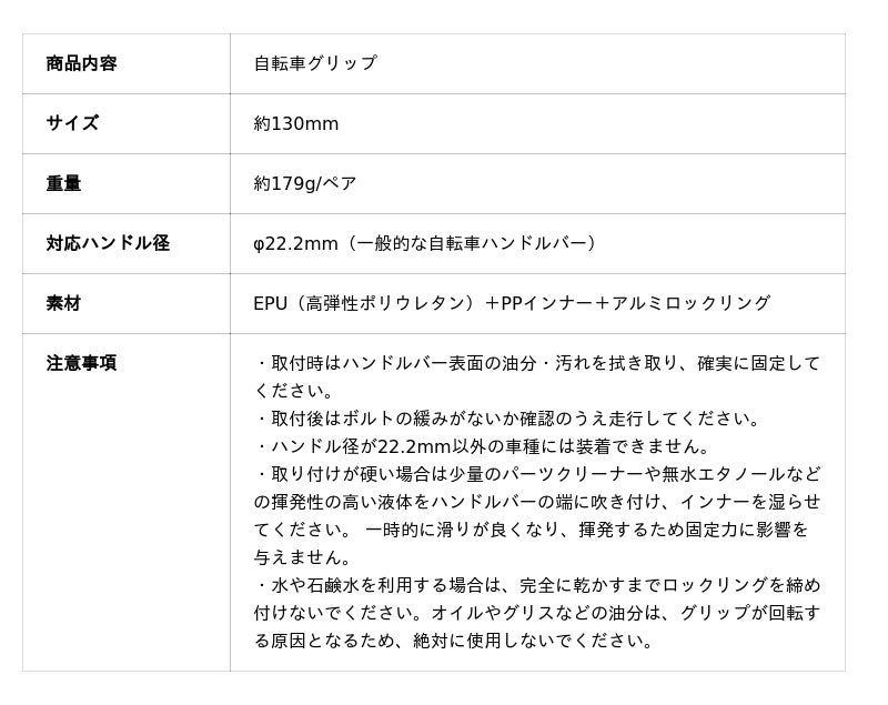 ●両端アルミロックオン構造で、走行中のグリップのズレ・回転を強力に防止
