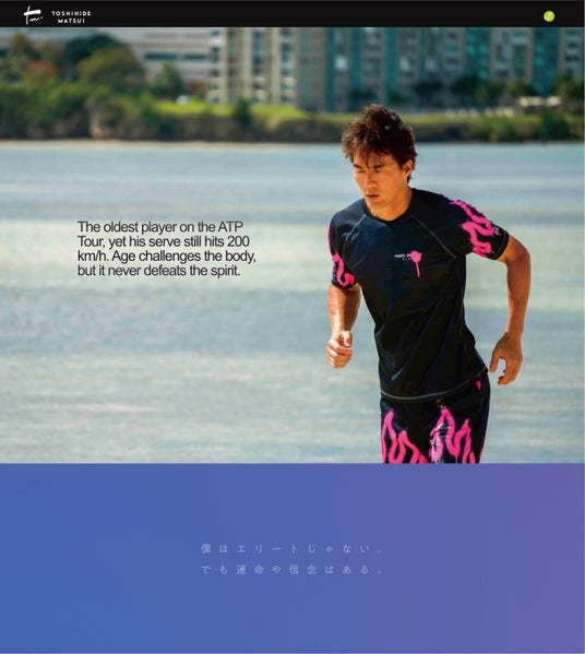 サイト全体のアートディレクションには、松井選手のプレースタイルやメンタリティを象徴する“太陽”のモチーフを採用。朝、昼、夕と日差しの照りつけるコートのなかで挑戦を続けるアスリートとしての姿勢を表現しています。