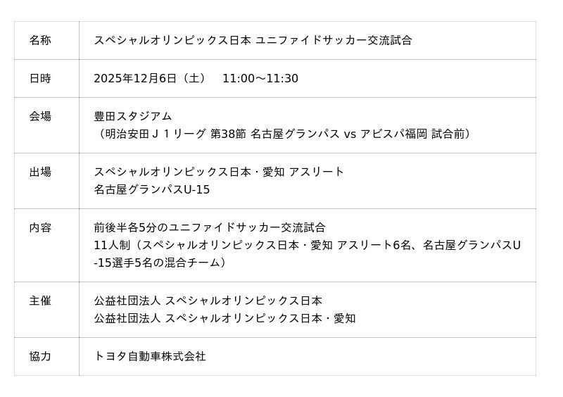12月6日(土)に豊田スタジアムで開催される 明治安田J1リーグ 第38節 アビスパ福岡戦の試合前に、特別なプレイベントとして「スペシャルオリンピックス日本 ユニファイドサッカー交流試合」が開催されることとなりましたのでお知らせいたします。